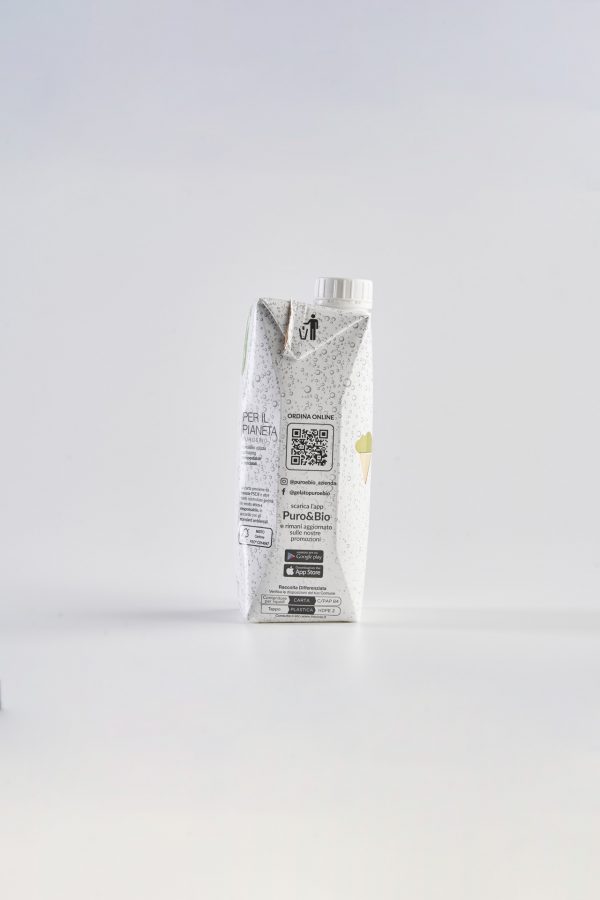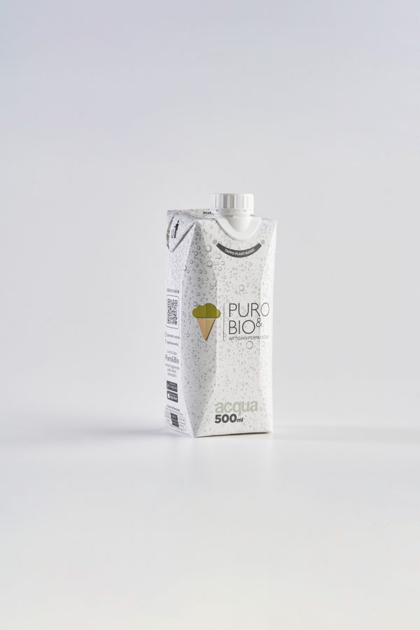 Acqua naturale in brick tetrapack logato Puro&Bio reciclabile e composto per il 76% da fonti vegetali
